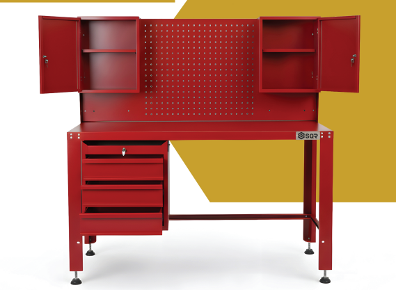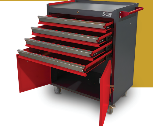 NAME: TOOL TROLLY 4 AND 2 MODELE: SQTO42025 DIMS: 70*45*95 CM تروللي 4 درج وضلفتين مصنوع من صاح سمك 1مم لضمان قوه وتحمل عالى مما